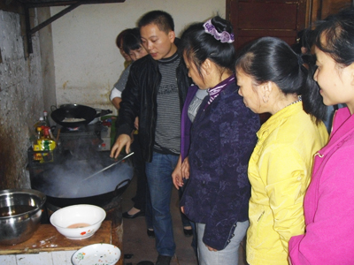 何师傅正在对家政员的厨艺进行现场指导